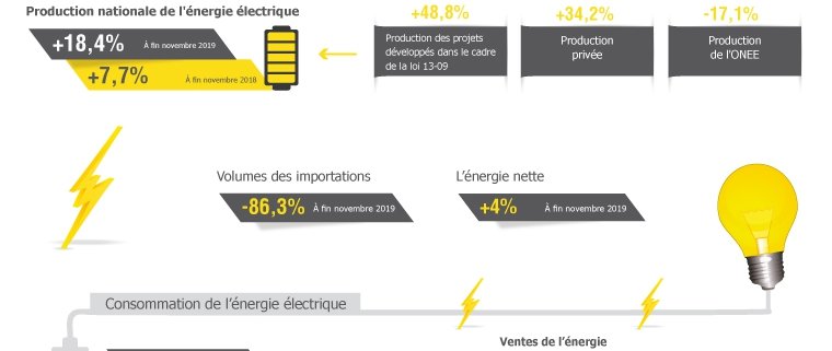 La production nationale de l’énergie électrique maintient sa bonne dynamique, marquant une hausse de 18,4% à fin novembre 2019, après +7,7% un an plus tôt, selon la Direction des études et des prévisions financières, relevant du ministère de l’Économie, des finances et de la réforme de l’administration.
