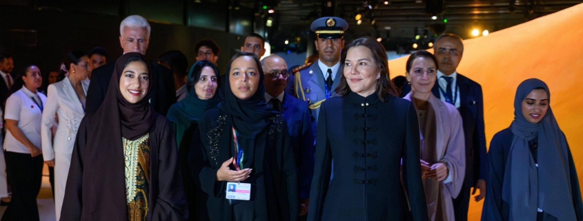 A l’entrée du Pavillon émirati « The UAE House Of Sustainability« , situé dans la Zone Verte, SAR la Princesse Lalla Hasnaa a été accueillie par Mme Razan Khalifa Al Mubarak, présidente de l’Union internationale pour la conservation de la nature et championne du climat de haut niveau de l’ONU pour la COP28.