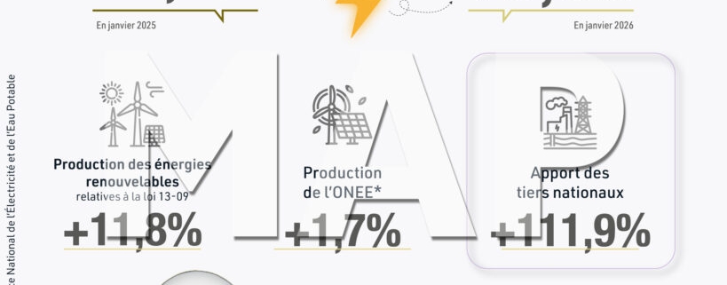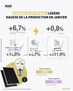 La production de l’énergie électrique au niveau national a enregistré une légère hausse de 0,8% en janvier 2026, après une progression de 6,7% un an auparavant, selon la Direction des études et des prévisions financières (DEPF) relevant du ministère de l’Économie et des Finances.